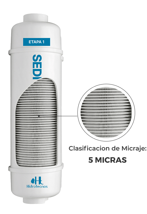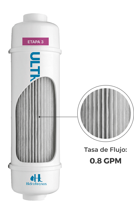 Filtra con eficiencia impurezas microscópicas. Esteriliza el agua y elimina hasta 99.99% de virus y bacterias